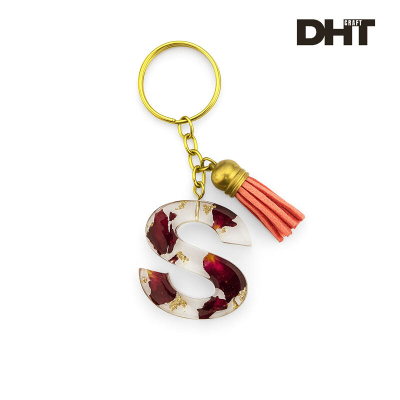 Elegant resin keychain featuring the letter “S” with real rose petals, gold flakes, and a soft tassel—perfect for gifting or everyday charm.